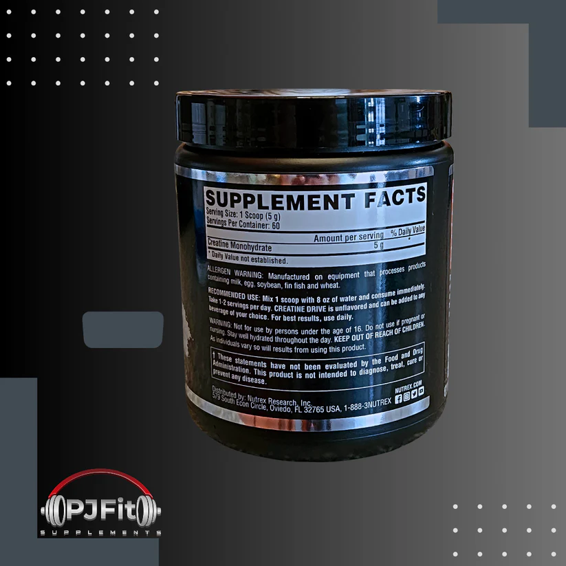 – La creatina Nutrex Drive está formulada con creatina monohidratada ultra pura y no contiene ingredientes innecesarios.